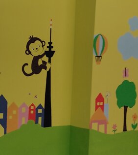 Im Turnraum des Kindergartens wurden die Wände liebevoll mit fröhlichen und verspielten Motiven bemalt. Die Kinder im Kindergarten freuten sich riesig über die neu gestalteten Wände mit den schönen Motiven. Besonders gut kam bei den Kindern ein Bild an, das einen Affen zeigt, der geschickt den Fernsehturm hinaufklettert.